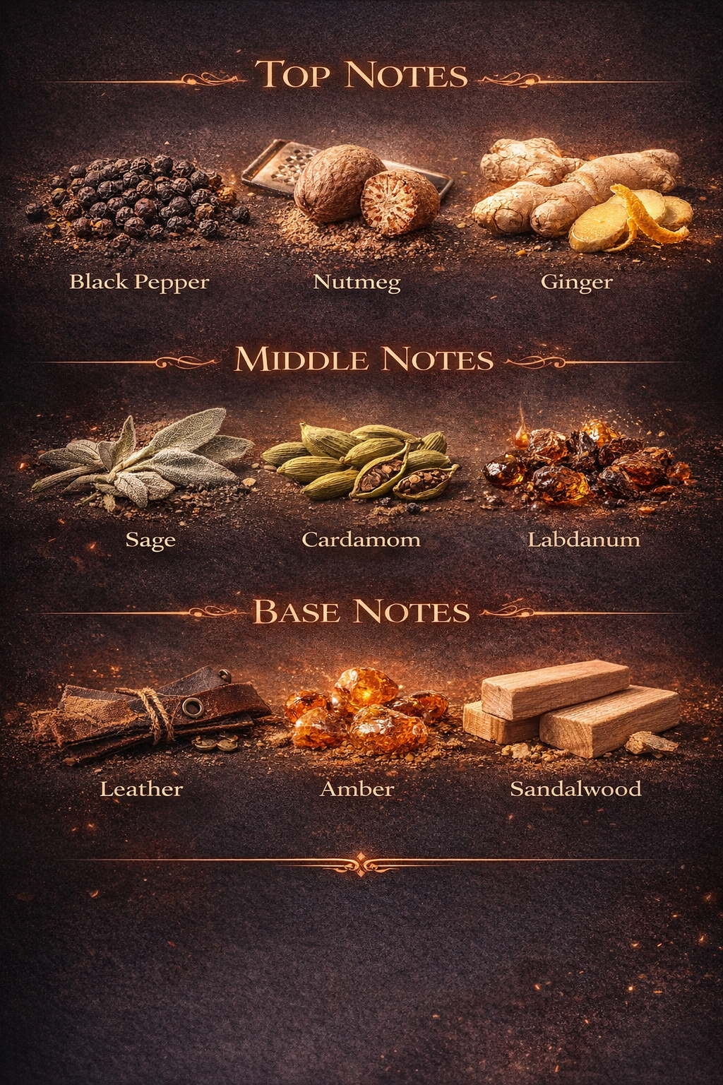 • Base Noter: Läder, Amber (Bärnsten), Sandelträ, Patchouli.