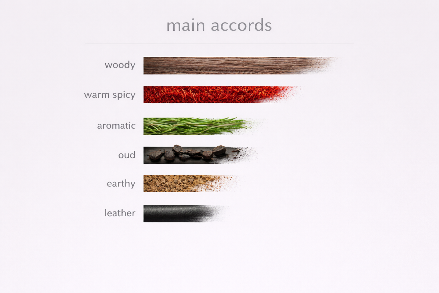 När doften utvecklas framträder hjärtats distinkta karaktär av aromatisk rosmarin. Denna friska, örtiga not bryter vackert av mot den varma kryddigheten och skapar en elegant balans. Doften landar slutligen i en extremt djup och hypnotisk bas av ren oud (agarträ). Ouden bidrar med en mörk, rökig och träig resonans som stannar kvar på huden i timmar och lämnar ett oförglömligt doftspår efter sig.