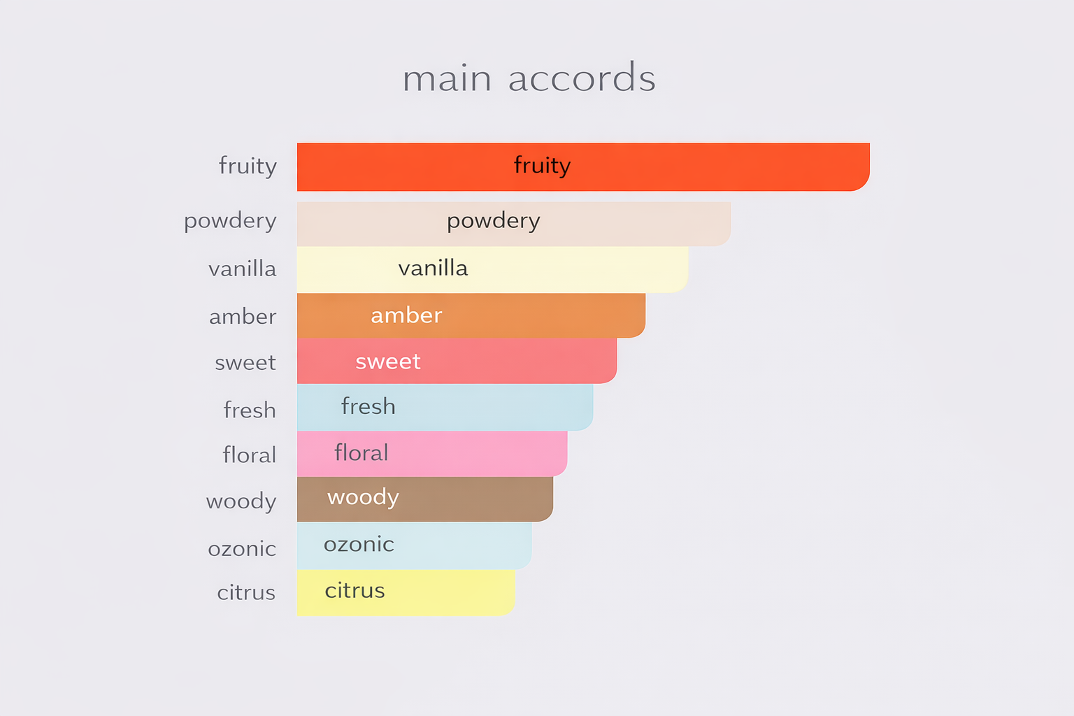 Doftupplevelsen öppnar storslaget med en saftig och exotisk korg av färska frukter. Här möts söt melon och mogen persika, som balanseras perfekt av frisk bergamott och mjuka, eleganta blomnoter från iris och freesia. Denna inbjudande och fräscha inledning övergår vackert till doftens varma och fylliga hjärta, där krispigt äpple möter gyllene amber, krämig tonkaböna och romantisk ros.