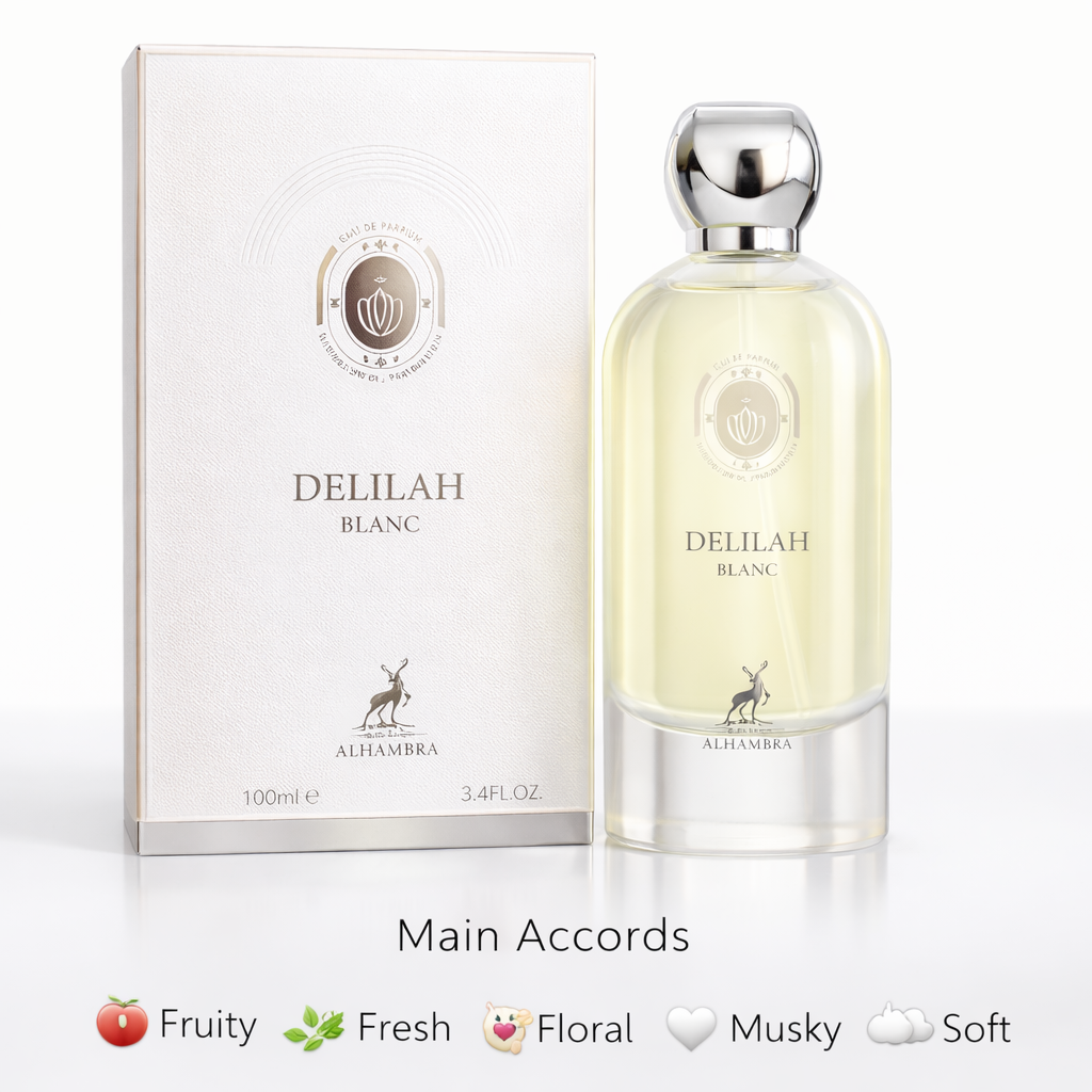 Maison Alhambra Delilah Blanc är en otroligt sofistikerad, ren och ljus parfym som fångar känslan av absolut fräschör och modern lyx. Denna Eau de Parfum är en mästerlig tolkning av doftkategorin som brukar kallas för ”clean and elegant”, där mjuka vita blommor möter krispig frukt och djup mysk. Den är skapad för den självsäkra individen som söker en parfym som utstrålar en mjuk men ändå kraftfull aura. Det är det ultimata valet för ljusa vår- och sommardagar, kontoret eller eleganta tillställningar när du vill lämna ett kristallklart och exklusivt doftspår efter dig. Doftnoter: